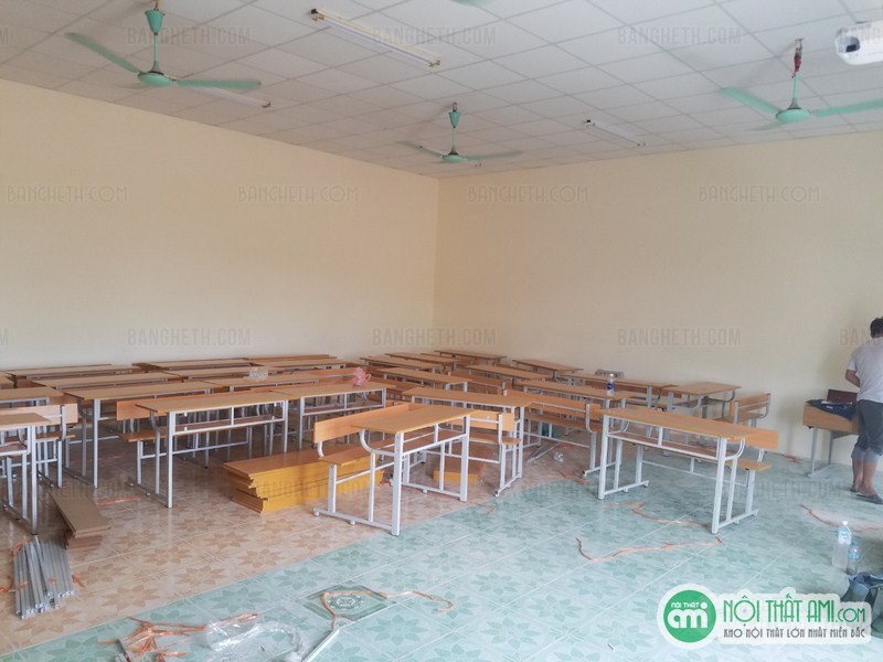 - Chất liệu bàn học sinh liền ghế tựa lưng giá rẻ được làm từ gỗ công nghiệp, chân sắt phun sơn tĩnh điện
